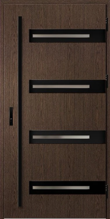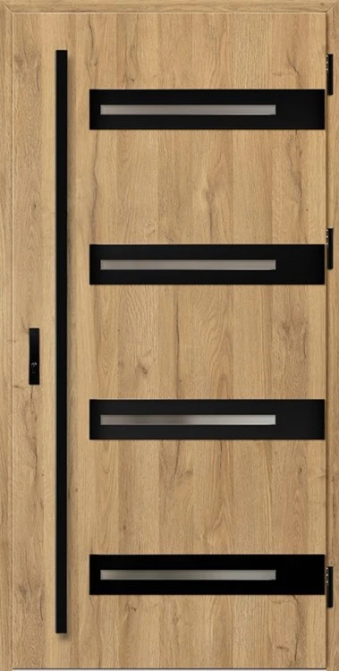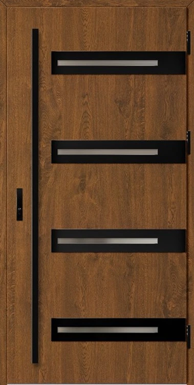 Exterior doors made of steel sheet, protected with PVC laminate, which provides high resistance to changing weather conditions, UV radiation and mechanical damage. The texture matching the decorative motif gives the product a high aesthetic value.