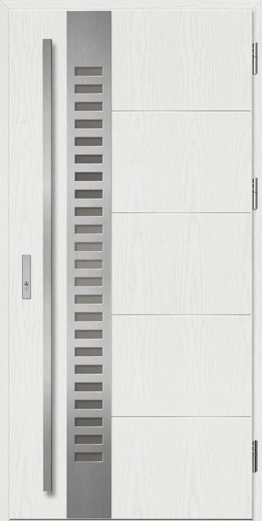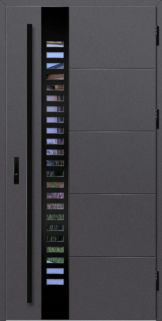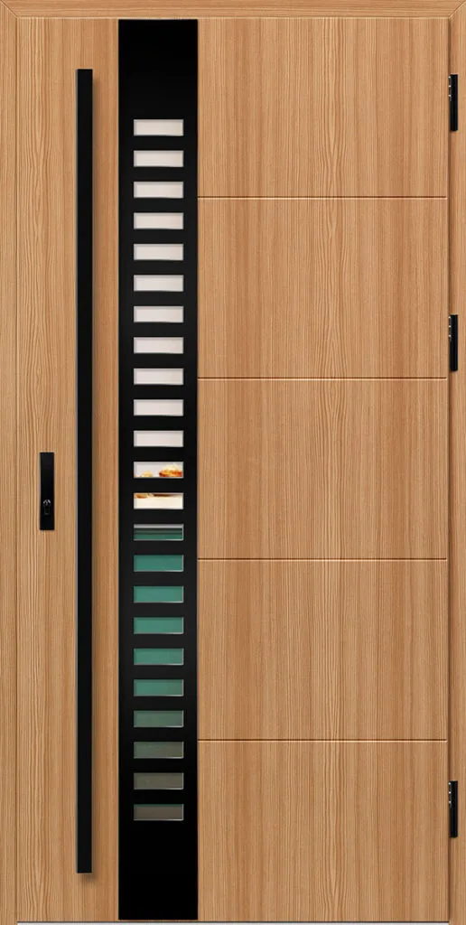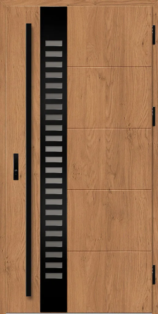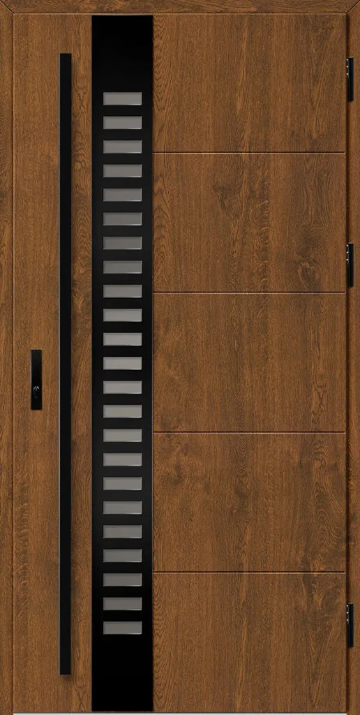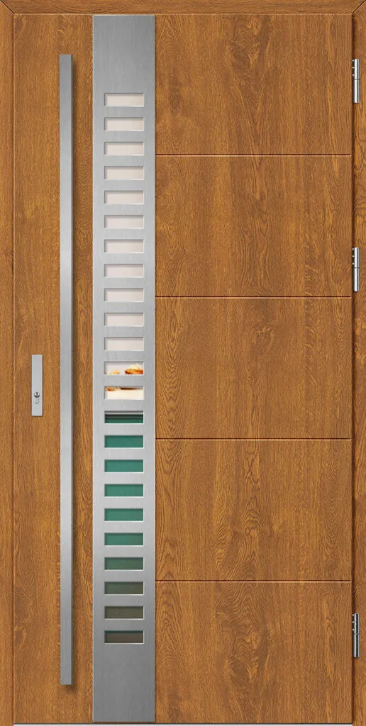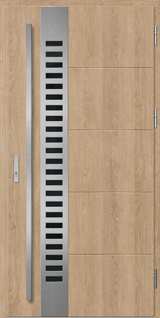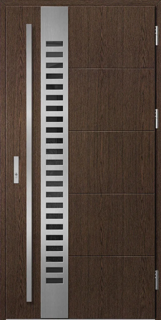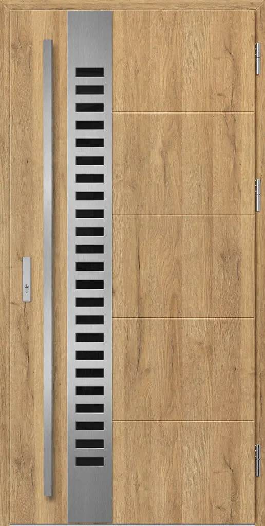 Exterior doors made of steel sheet, protected with PVC laminate, which provides high resistance to changing weather conditions, UV radiation and mechanical damage. The texture matching the decorative motif gives the product a high aesthetic value.