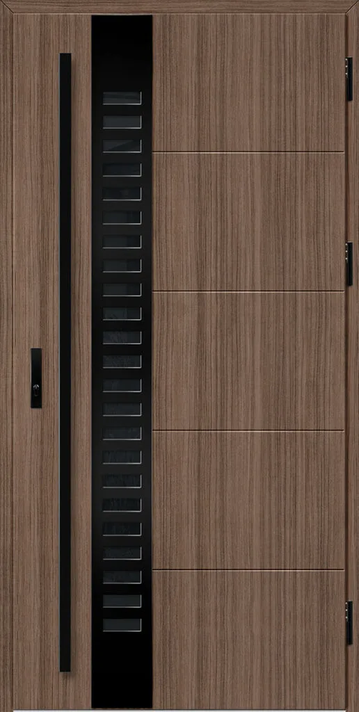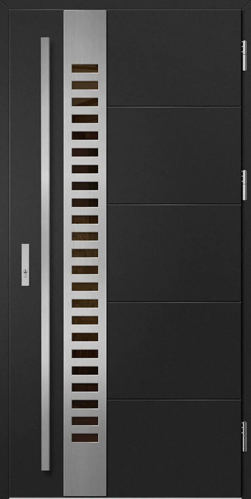 Aluminum frame structure – painted black and covered with laminate in the same color as the door leaf, with warm aluminum threshold and fully adjustable lock plate, for doors with THERMO HOT technology.