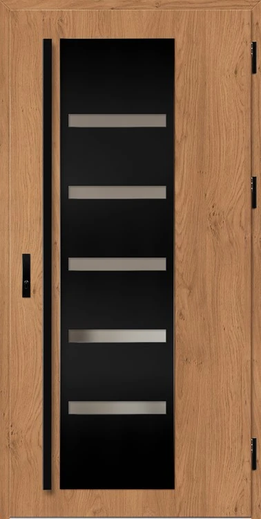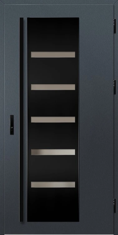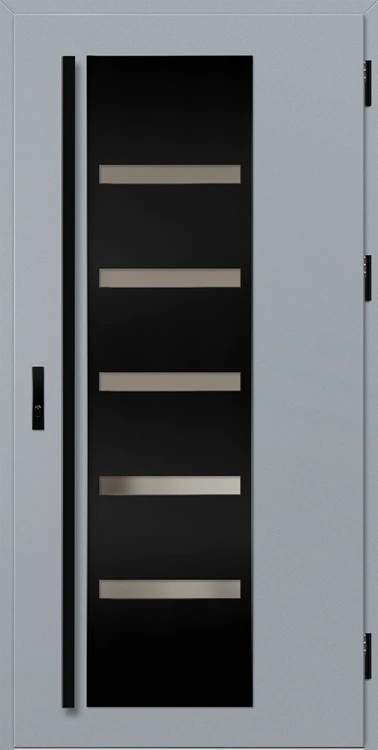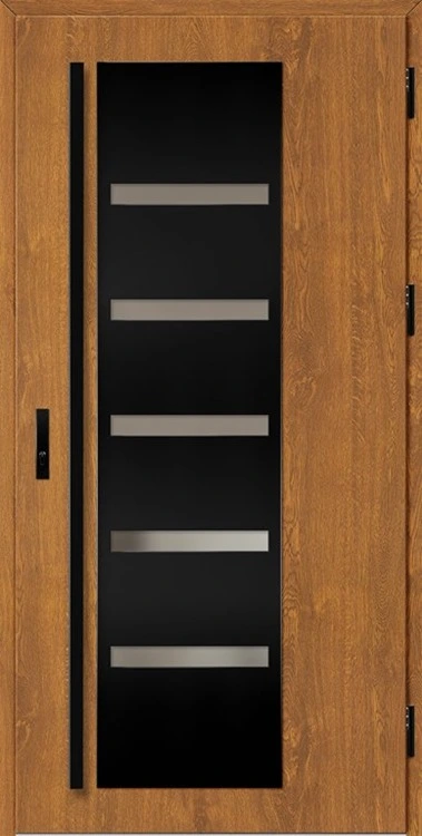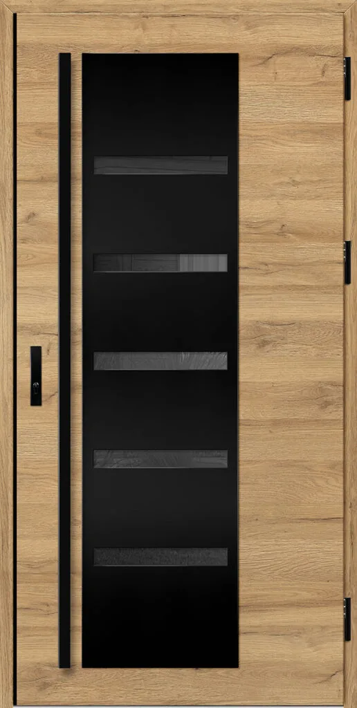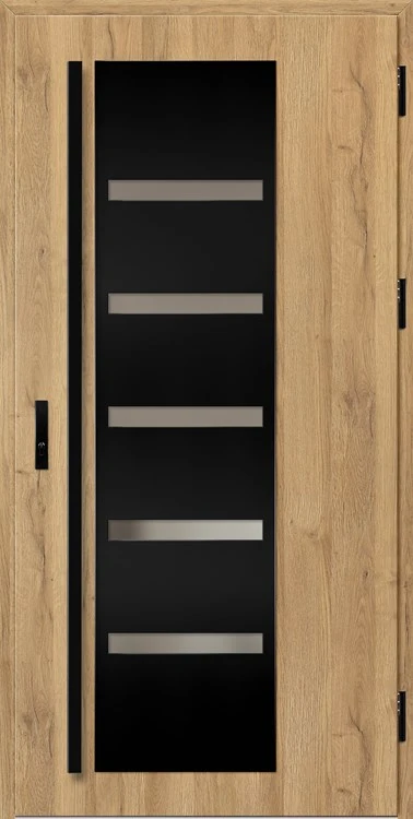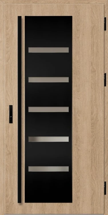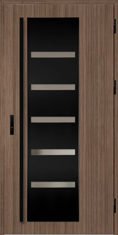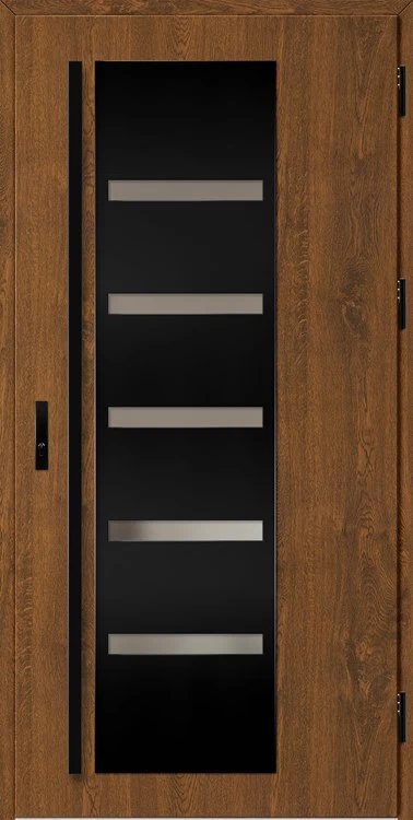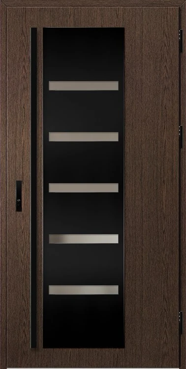 Acéllemezből készült bejárati ajtók, PVC laminátummal védve, amelyet a változó időjárási körülményekkel, UV-sugárzással és mechanikai sérülésekkel szembeni magas ellenálló képesség jellemez. A dekoratív motívumhoz illeszkedő textúra magas esztétikai értékű terméket hoz létre.