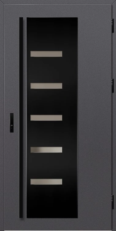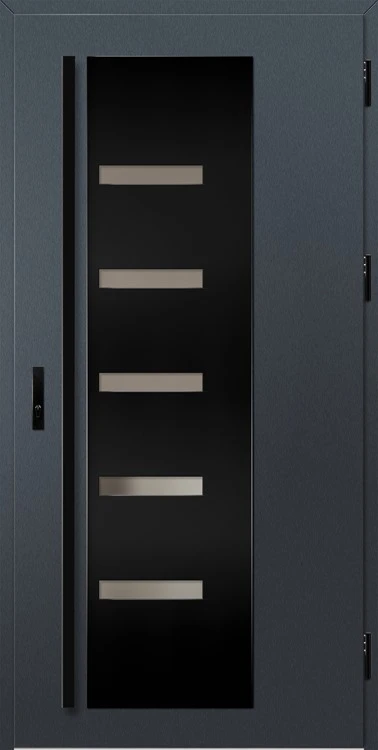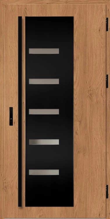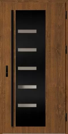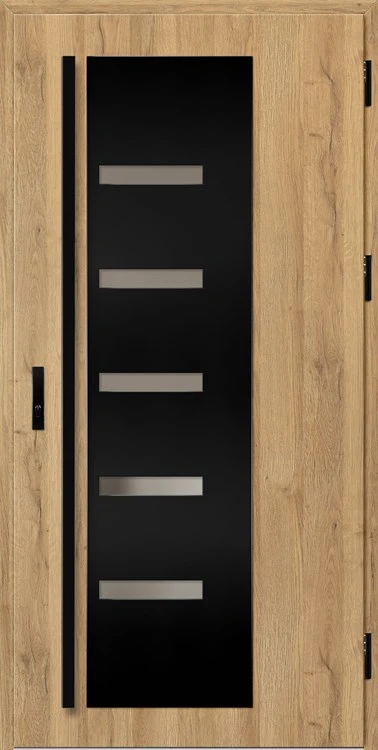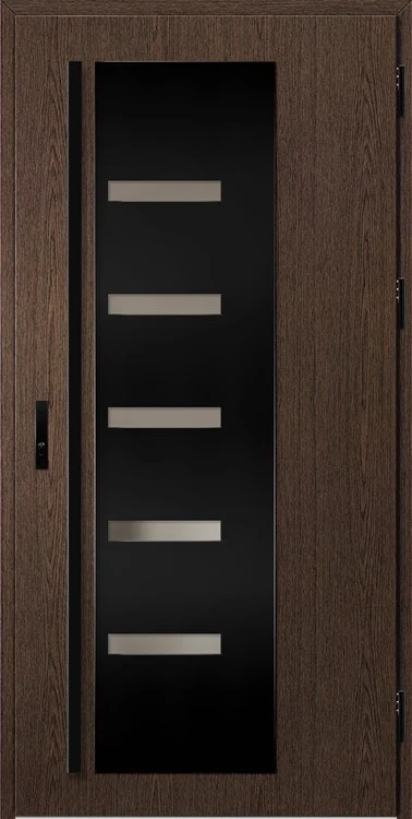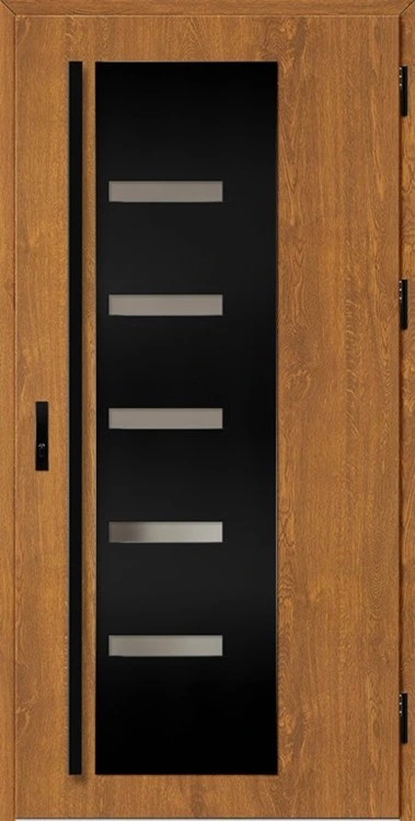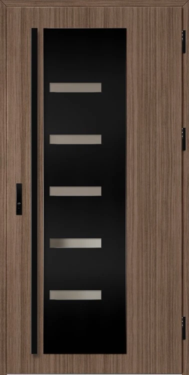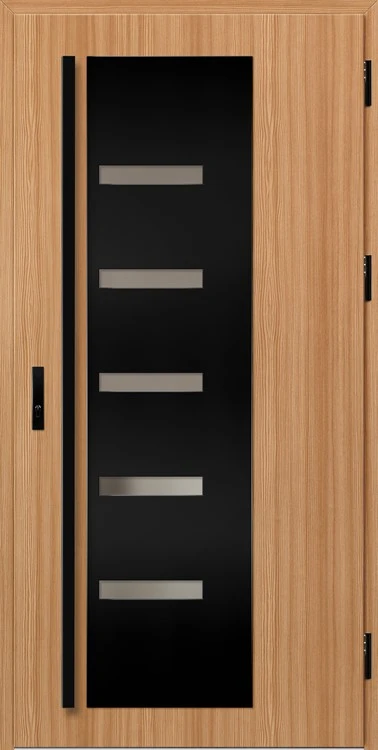 Acéllemezből készült bejárati ajtók, PVC laminátummal védve, amelyet a változó időjárási körülményekkel, UV-sugárzással és mechanikai sérülésekkel szembeni magas ellenálló képesség jellemez. A dekoratív motívumhoz illeszkedő textúra magas esztétikai értékű terméket hoz létre.