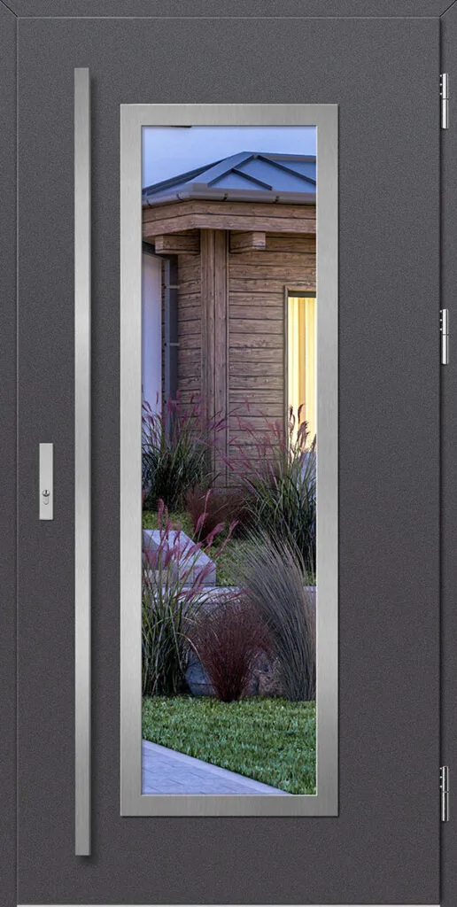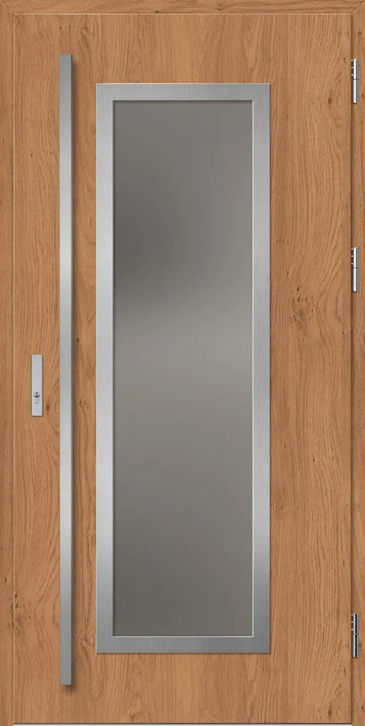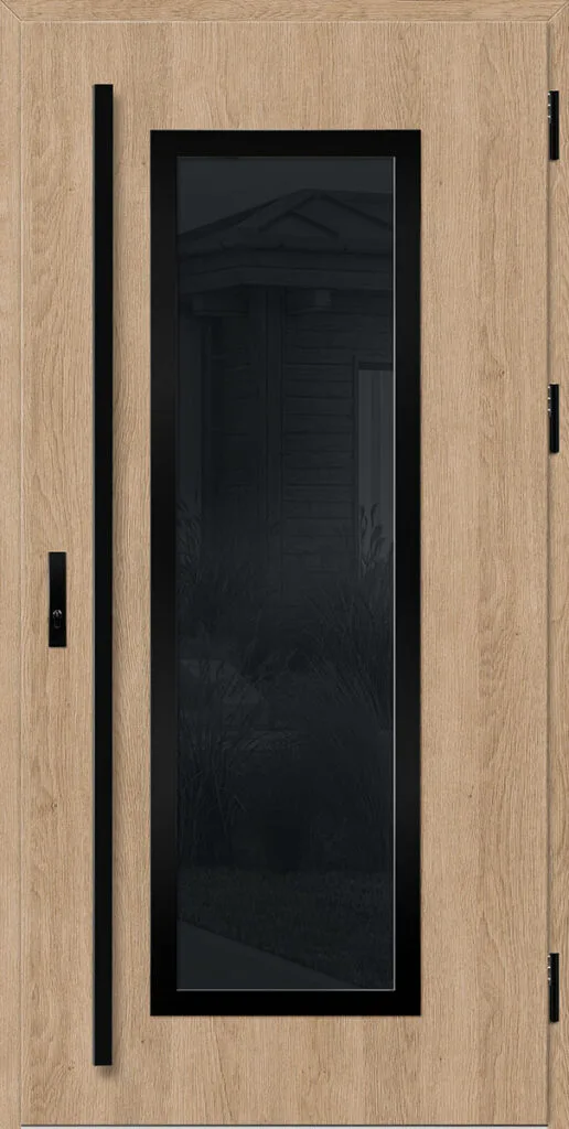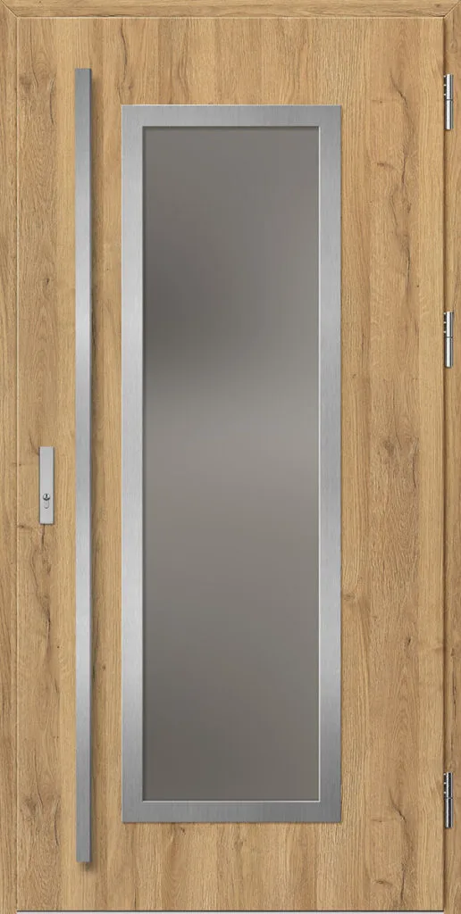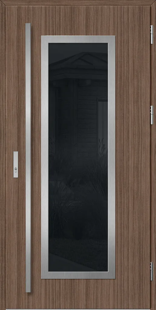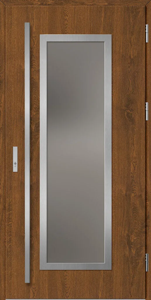 Acéllemezből készült bejárati ajtók, PVC laminátummal védve, amelyet a változó időjárási körülményekkel, UV-sugárzással és mechanikai sérülésekkel szembeni magas ellenálló képesség jellemez. A dekoratív motívumhoz illeszkedő textúra magas esztétikai értékű terméket hoz létre.