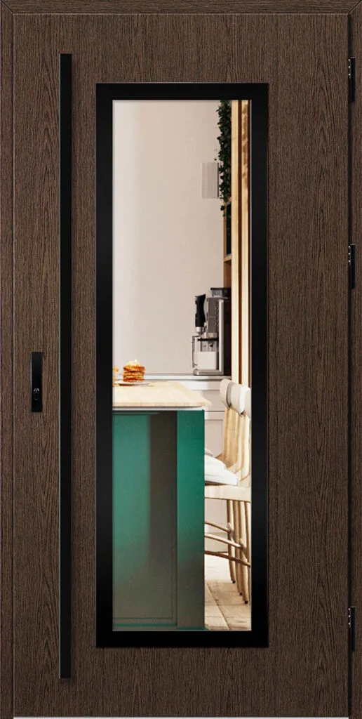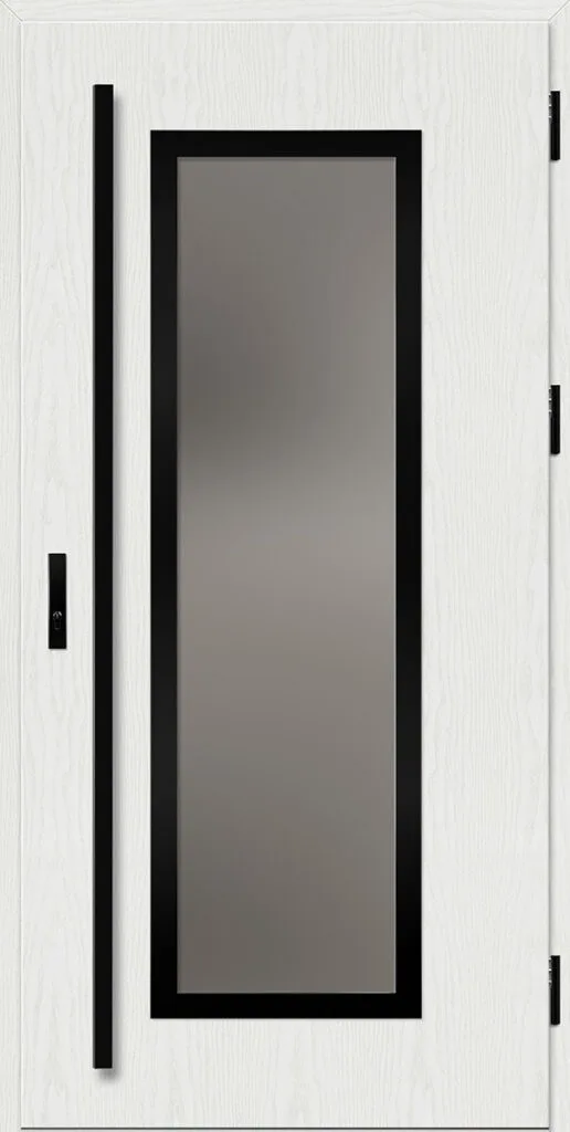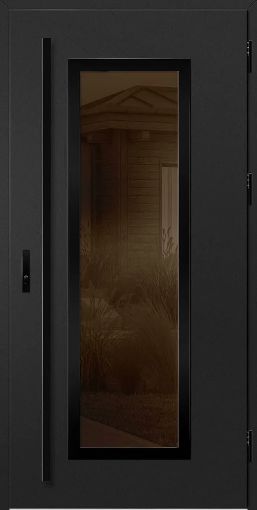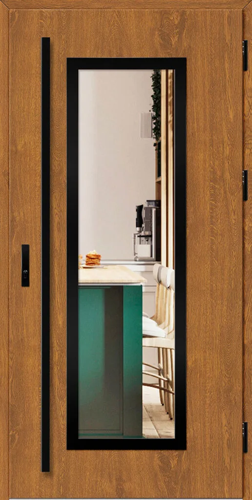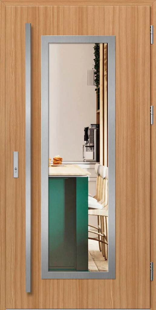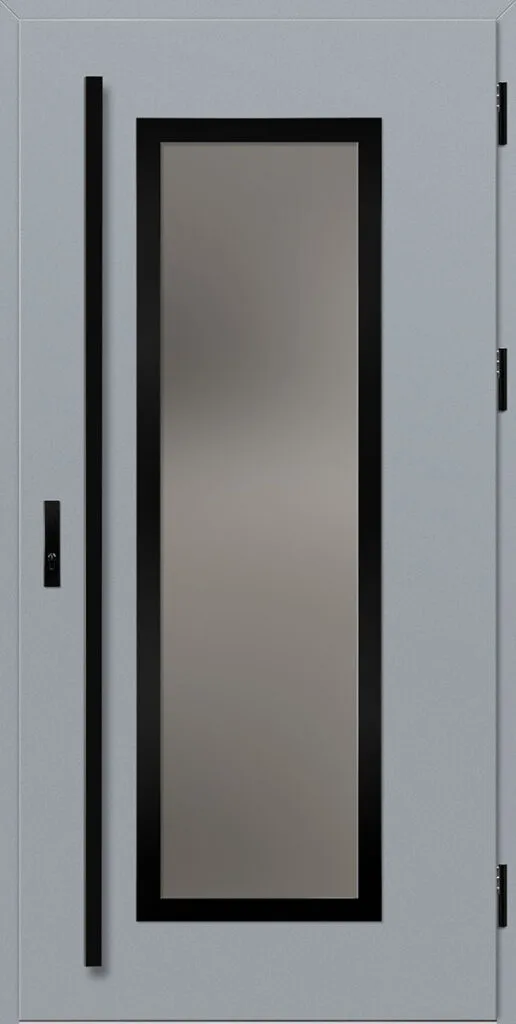 Acéllemezből készült bejárati ajtók, PVC laminátummal védve, amelyet a változó időjárási körülményekkel, UV-sugárzással és mechanikai sérülésekkel szembeni magas ellenálló képesség jellemez. A dekoratív motívumhoz illeszkedő textúra magas esztétikai értékű terméket hoz létre.