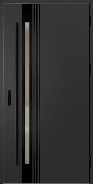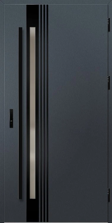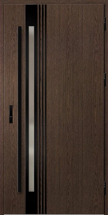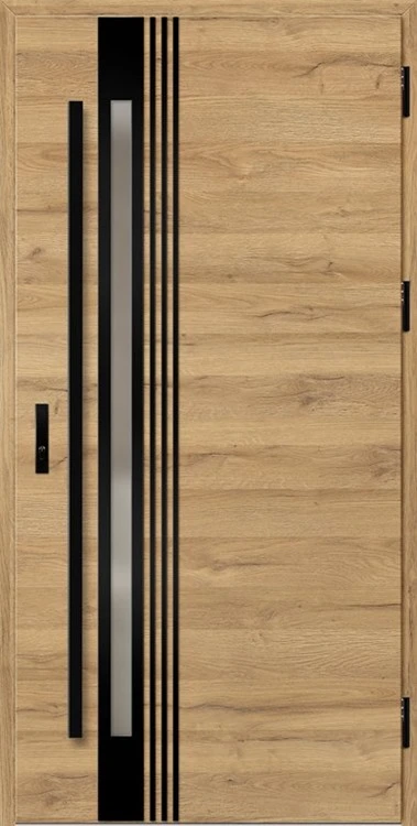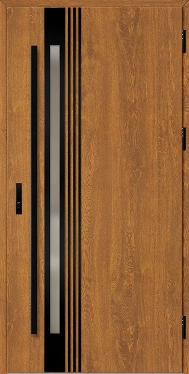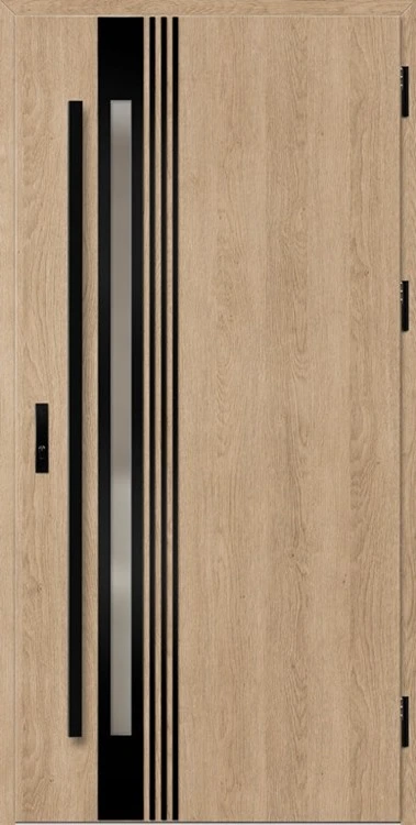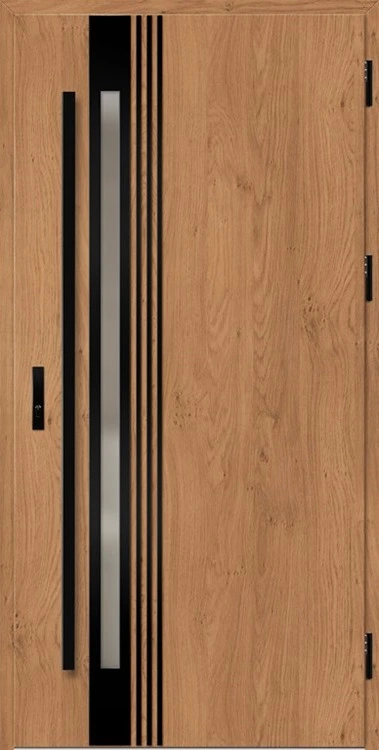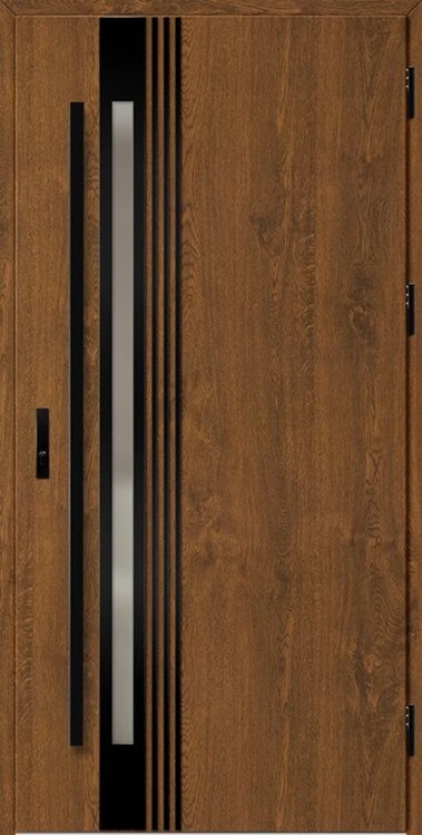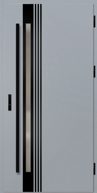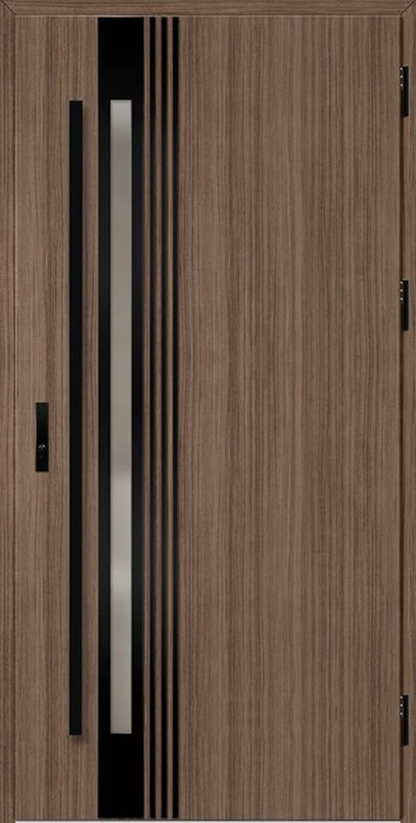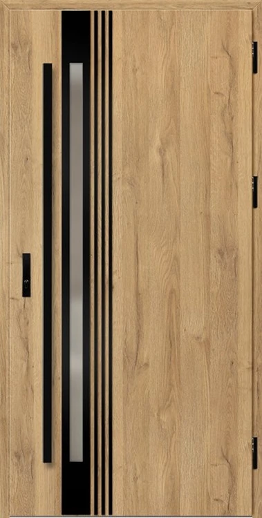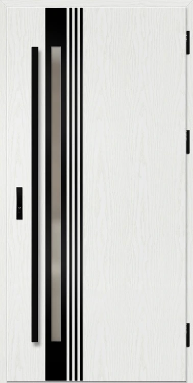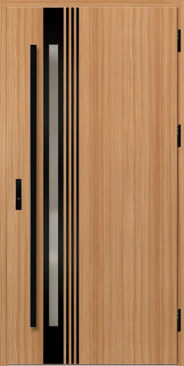 Acéllemezből készült bejárati ajtók, PVC laminátummal védve, amelyet a változó időjárási körülményekkel, UV-sugárzással és mechanikai sérülésekkel szembeni magas ellenálló képesség jellemez. A dekoratív motívumhoz illeszkedő textúra magas esztétikai értékű terméket hoz létre.