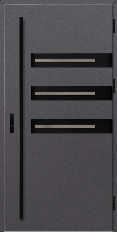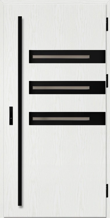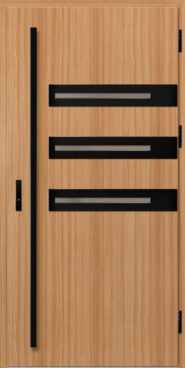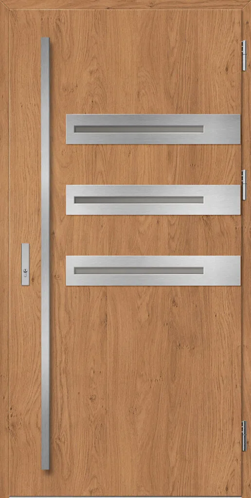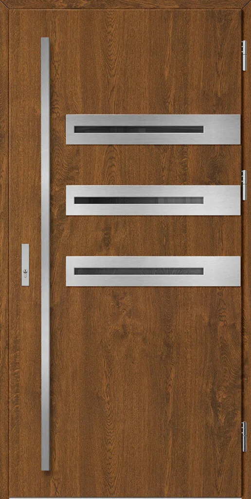 Kültéri ajtók acéllemezből, PVC laminátummal védve, amely nagy ellenállást biztosít a változó időjárási körülményekkel, az UV-sugárzással és a mechanikai sérülésekkel szemben. A dekoratív motívumhoz illeszkedő textúra magas esztétikai értéket kölcsönöz a terméknek.